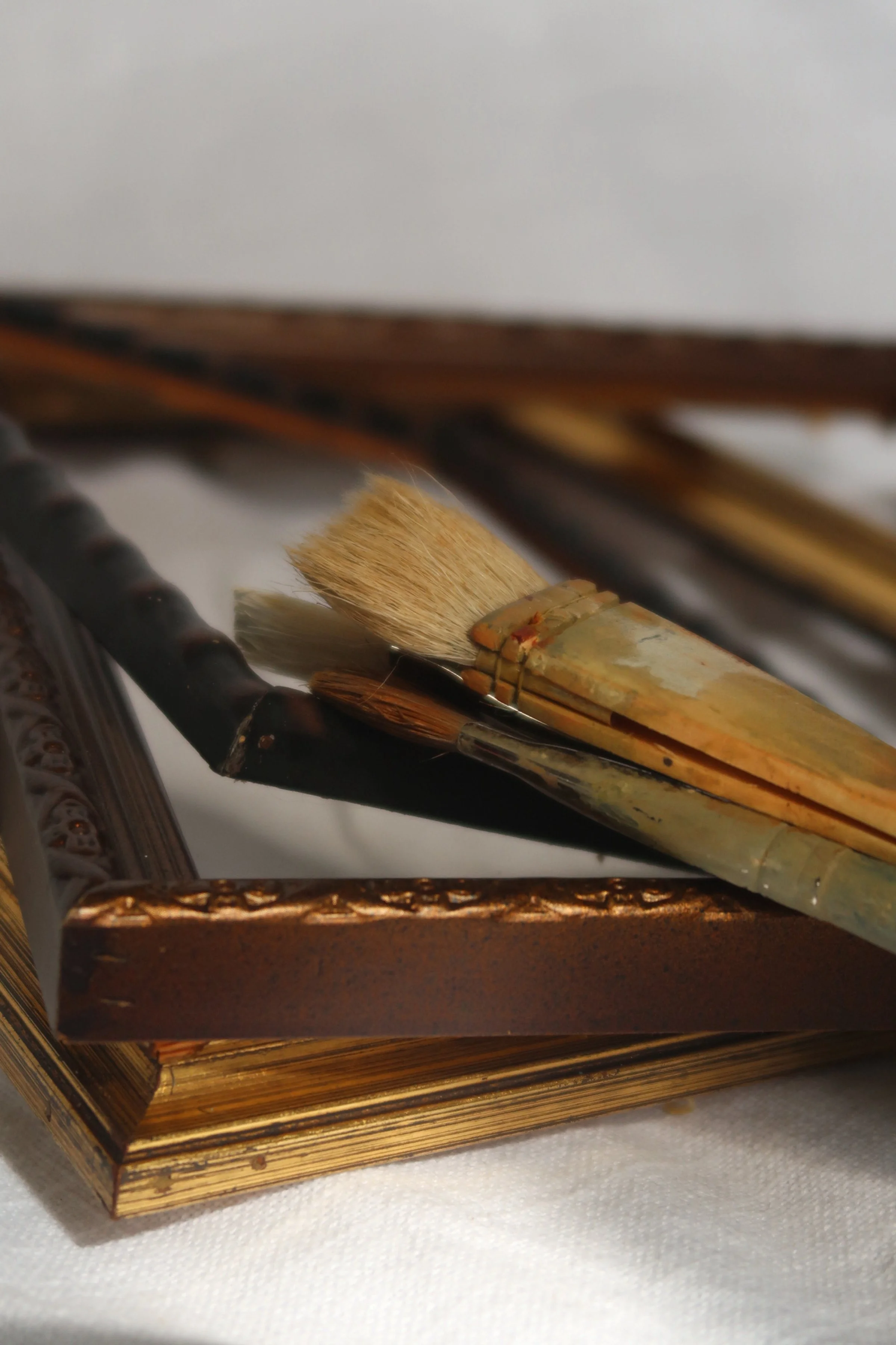 I paint mainly in oils on textured cotton paper — mounted in antique or vintage frames to add timeless character.