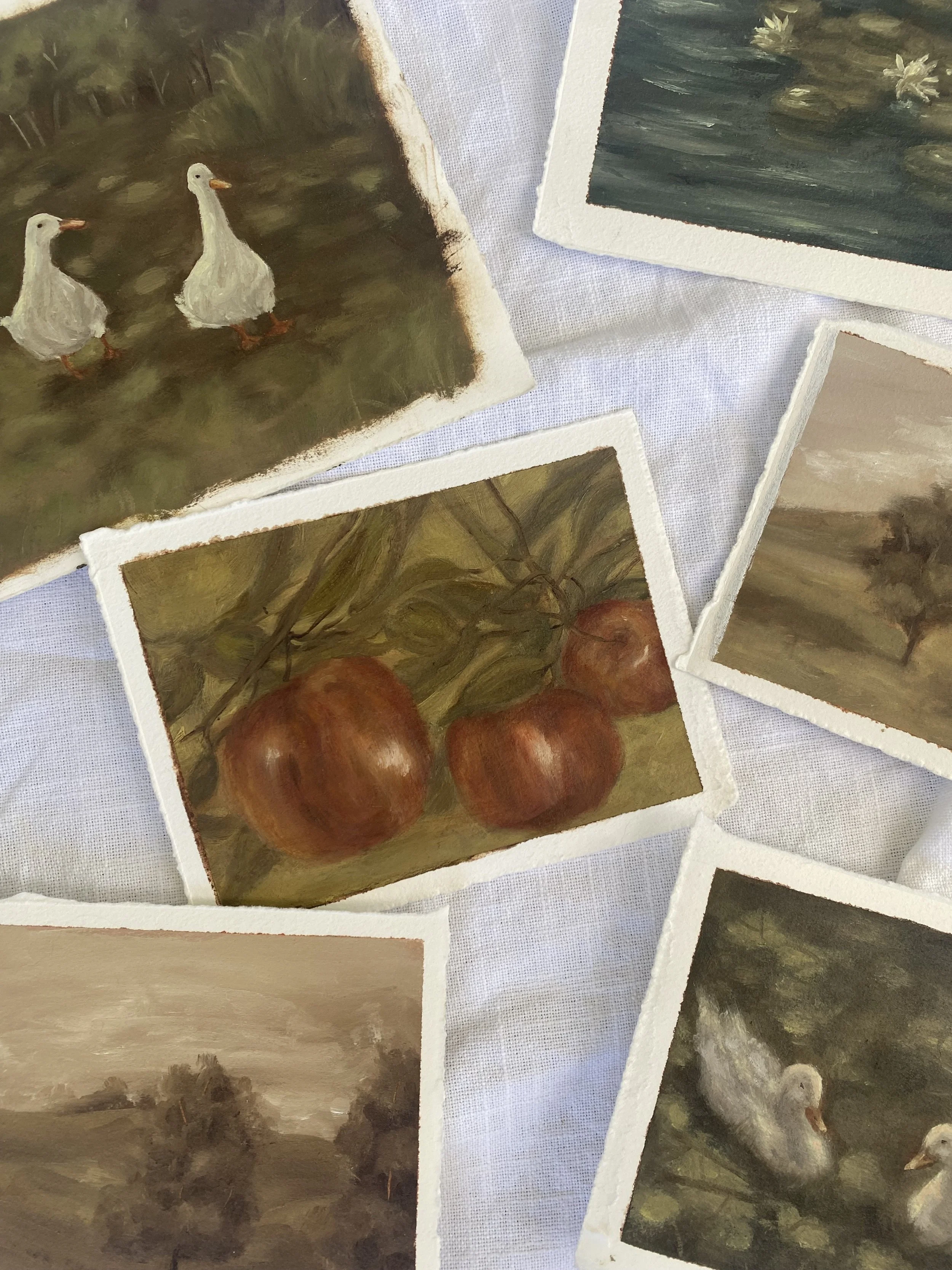 Fragments of the larger vision Original Oil Studies 'Lillys' - Study $200.00 Sold out 'Landscape I' - Study $200.00 'Ducks I' - Study $200.00 Sold out 'Ducks II" - Study $240.00 Sold out 'Landscape II' - Study $200.00 'Apples' - Study $200.00